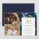 Esta elegante invitación de aniversario de bodas de 50 años en azul marino y dorado con flores puede ser personalizada con su información en tipografía moderna y dos fotos especiales. Diseñada por Thisisnotme©