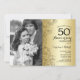 Invitación floral negra dorada con foto de aniversario 50. Diseño moderno con acentos de dibujos de contorno botánico y tipografía de letra script. Tarjeta de invitación de moda simple perfecta para una celebración de aniversario de bodas dorado cincuenta con estilo. Se puede personalizar para reflejar cualquier año de matrimonio. Impreso en invitaciones de Zazzle o plantilla digital descargable instantáneamente.
