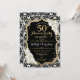 Diseño elegante en negro, blanco y dorado con brillo falso. Estilo, patrón de damasco, fuente script con rosas blancas.