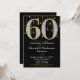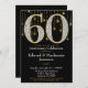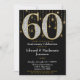 Una elegante invitación para una fiesta de aniversario 60 en negro y dorado, con un gran 60 con diamantes y apariencia dorada junto con una cortina brillante de luces doradas.