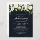 Esta invitación de aniversario de bodas 50 verde floral blanco es perfecta para un evento rústico. El diseño presenta elegantes peonías blancas de acuarela con follaje verde en un fondo azul oscuro. Cambie el número para celebrar cualquier aniversario.