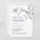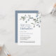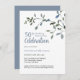 Este sencillo diseño de aniversario presenta vegetación en acuarela con acentos azules, fondo blanco y tipografía elegante.