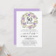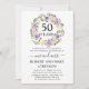 Una corona bonita y elegante de flores blancas y púrpura rodea 50 años para coronar esta invitación a la fiesta de aniversario de bodas de 50 años. El texto es una combinación de caligrafía moderna y texto clásico vertical. El color gris complementa las flores de cerezo.