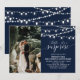 Celebra tu día especial con esta invitación personalizada de aniversario de bodas con foto. Este diseño presenta hermosa tipografía "shhh... es una sorpresa" y luces de cuerda sobre un fondo azul marino. Puedes personalizar el texto para cualquier año. Reemplaza la foto de muestra con tu propia foto. Suministros para fiestas a juego disponibles en mi tienda BaraBomDesign.