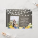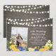 Celebre su día especial con esta invitación personalizada de aniversario de bodas con foto. Este diseño presenta hermosas flores azules y amarillas y luces de cuerda en un fondo de madera rústica. Puede personalizar el texto para cualquier año. Reemplace la foto de muestra con su propia foto. Suministros para fiestas a juego disponibles en mi tienda BaraBomDesign.