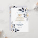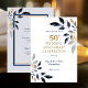 Una tarjeta de invitación de bodas de oro de 50 aniversario de boda en oro y azul marino. Reúna a amigos y familiares para honrar a una pareja especial en su 50 aniversario de bodas. Esta invitación de fiesta de 50 aniversario de bodas está diseñada con texto en oro y azul marino y acentos de hojas. El texto incluye: Celebración del 50 aniversario de bodas, en honor, nombres de la pareja y fecha del evento. El texto del reverso incluye: la fecha, hora, ubicación y detalles de RSVP. Para personalizar, simplemente inserte sus datos en nuestra plantilla fácil, reemplazando el texto de muestra. Nota: esta invitación tiene una pancarta retráctil de 50 aniversario de bodas disponible.