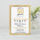 Celebre su aniversario de bodas de oro con esta invitación a la fiesta de aniversario de bodas Feliz 50 años. Este diseño presenta un hermoso fondo metálico dorado falso con un marco negro. La parte trasera presenta una textura dorada falsa simple y elegante. Mezcle y combine con otros elementos de esta colección de aniversarios.