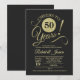 Invitación a la fiesta del 50 aniversario en negro y dorado. Tarjeta de invitación elegante con patrón de pizarra y fuente de escritura tipográfica. ¡Salud por 50 años! Perfecta para una celebración de aniversario dorado cincuenta con estilo.
