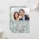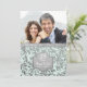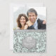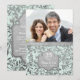 Invitación encantadora para el vigésimo quinto aniversario de bodas sobre un fondo de menta acuarela con una superposición de elegantes hojas de plata. Estandarte plateado a juego en la parte delantera y trasera de la tarjeta. Sube una foto especial para reemplazar el marcador de posición de esta plantilla de foto. Personalice el texto de la parte frontal y posterior de la invitación con su información. Este diseño está disponible en otros artículos de mi tienda.