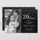 Invitación de aniversario de bodas número 20 con foto. Diseño elegante en plateado y negro con letra script y confeti de diamantes. Se puede personalizar para mostrar cualquier año de casados. ¡Salud por 20 años!