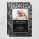 Elegante invitación de aniversario de bodas vigésimo quinto en damasco floral negro y plateado con borde de acento plateado para celebrar esa fecha especial de veinticinco años juntos. Sube una foto para reemplazar el marcador de posición de la foto. Personaliza el texto del anverso y reverso de la invitación con la hora, fecha, ubicación y otra información.