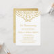 Esta elegante invitación para una fiesta de aniversario vintage cuenta con un delicado adorno de damasco dorado sobre un fondo blanco.