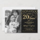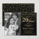 Invitación de Aniversario de Bodas número 20 con Foto. Diseño elegante en dorado y negro con letra script y confeti. Se puede personalizar para mostrar cualquier año de matrimonio. ¡Salud por 20 años!
