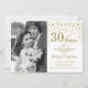 Invitación de Aniversario de Bodas número 30 con Foto. Diseño elegante en dorado y blanco con letra script y confeti. Se puede personalizar para mostrar cualquier año de matrimonio. ¡Salud por 30 años!