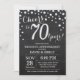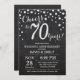 Aniversario de bodas número 70 Invitación de pizarra negra y plateada. Aniversario de bodas setenta. Fondo de diamante con brillo negro y plateado. Confeti plateado. Cumpleaños adulto. Fiesta de cumpleaños de mujer o hombre. Para una mayor personalización, haga clic en el botón "Personalizar" y use nuestra herramienta de diseño para modificar esta plantilla.
