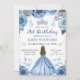 Elegante acuarela Blonde Haired princesa con diseño de vestimenta azul claro con flores azules, mariposas y confeti purpurina plateado.