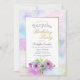 Invitación a una fiesta de cumpleaños floral azul y rosa con un borde de acuarela pintado de oro y pastel.