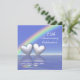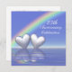 Invitación de aniversario de plata número 25 con un arcoíris y dos corazones plateados brillantes flotando en el agua azul. Personalice el texto de ejemplo en la parte posterior con su propia información para su evento.
