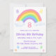 Una invitación a la fiesta de cumpleaños, con estilo de tiza, arcoiris pastel y nubes. El arco iris y el gran número rosado también aparecen en el reverso de la invitación.