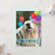 Esta invitación a la fiesta incluye una fotografía de un perro recuperador de oro sonriente en un banco del parque, rodeado de globos coloridos. El texto en la parte delantera dice: "¡Es un Fiesta!" ¡personalizar la espalda con todos los detalles de tu gran día!