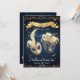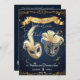 Celebre con estilo esta lujosa invitación de cumpleaños con temática de mascarada, con intrincadas máscaras doradas venecianas contra un fondo azul marino. Elegante fibra, arañas de color perla y brillantes acentos dorados añaden sofisticación. Perfecto para celebraciones de cumpleaños, bailes de máscaras y eventos exclusivos.