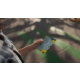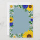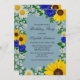 Invitación rústica de cumpleaños con girasoles vibrantes, daises blancos tradicionales y flores azul marino contra un fondo azul con el aliento del bebé y acentos botánicos de vegetación