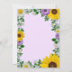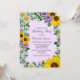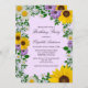 Invitación rústica de cumpleaños con girasoles vibrantes, daisies blancos tradicionales y flores violetas coloridas contra un fondo morado claro con el aliento del bebé y acentos de vegetación botánica