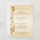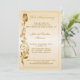 Elegante invitación de cumpleaños número 50 con flor desplazada dorada en el borde izquierdo y marco delgado sobre fondo degradado de oro pálido.