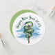 2025 Años - Serpiente de madera en el horóscopo chino Un ilustracion acuarela de una serpiente verde enrollado alrededor de un personal de madera. El personal tiene un símbolo circular en la parte superior. El fondo es un cielo azul claro con algunas nubes. Hay un texto "Feliz Año Nuevo 2025" escrito en verde sobre la serpiente.