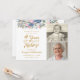 Invitar a los invitados a una fiesta de cumpleaños # AÑOS EN EL HECHO para cualquier cumpleaños de edad para ella con estas invitaciones con un diseño editable de título de tipografía caligráfica en oro que incorpora su edad y año de nacimiento dentro del diseño, un borde de ramo floral con flores azules, rosas y blancas acentuadas con vegetación y hojas de oro y personalizado con 2 fotos (tal vez usar fotos de Entonces y Ahora para un recuerdo memorable). CAMBIOS: Cambie el color de fondo negro o seleccione un fondo gráfico estilizado haciendo clic en PERSONALIZAR MÁS AÚN debajo de la sección PERSONALIZAR. Póngase en contacto con el diseñador a través de Zazzle Chat o makeitaboutyoustore@gmail.com si desea modificar este diseño, ayuda con un esquema de color diferente, transferido a otro producto o desea coordinar elementos.
