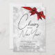 Elegante plantilla de Invitación a la fiesta de Año Nuevo de invierno con motivo de luces de bokeh purpurina y arco rojo. Impresiona a tus amigos con este sofisticado y moderno diseño de invitación. ¡personalizable total!