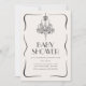 Esta caprichosa invitación vintage para baby shower presenta un marco delicado y elegante que bordea toda la tarjeta, dando un toque atemporal y encantador. En la parte superior, un candelabro vintage bellamente ilustrado cuelga con gracia, proyectando un aire de sofisticación y nostalgia. En el centro, los detalles de la fiesta se presentan en una elegante letra con amplio espacio para una fácil edición. El diseño general emana una suave y encantadora atmósfera que combina perfectamente el encanto vintage con un estado de ánimo caprichoso y festivo, ideal para una sofisticada reunión de baby shower.