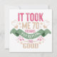 Colores vintage retro decorativos con efecto desgastado y sucio en el diseño. Cita divertida y sarcástica para decir los 70 años con la frase me tomó 70 años verme así de bien. Idea perfecta para regalar en cumpleaños a papá, mamá, abuela, abuelo, amigo, tío y tía