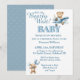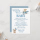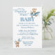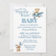 Personalice esta linda invitación de baby shower de osito de peluche con sus propias palabras utilizando el botón de personalizar. La invitación presenta a un pequeño y adorable osito de peluche volando hacia abajo en un avión azul. Otro osito de peluche sostiene globos en la esquina inferior izquierda. El reverso es azul con lunares blancos.