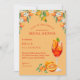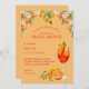 Celebra con estilo con esta invitación personalizada, ¡amor en primera Spritz Bridal Shower! Este encantador diseño cuenta con un elegante arco de vibrantes naranjas cítricos mezclados con exuberante vegetación y delicadas flores de naranja blanco, que capturan la esencia de la belleza mediterránea. En el centro del diseño hay un delicioso y refrescante cóctel Aperol Spritz, que se exhibe en un elegante vaso alto lleno de hielo y adornado con una rebanada de naranja. Todo ello rodeado de un suave fondo naranja de moda, le aporta un toque perfecto de sofisticación y deleite a su ducha nupcial. ¡Ideal para celebrar una fiesta alegre y soleada!