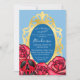 La invitación a este partido personalizado incluye un tema de cuento de hadas de Blancanieves sobre un fondo azul claro. En el centro se coloca una imagen de un espejo dorado, con la información del evento y del lugar. Las rosas rojas y una manzana venenosa roja acentúan la parte inferior.