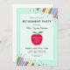 Esta colorida invitación a la fiesta de retiro es un diseño para un profesor. El fondo es verde claro acentuado con un gráfico de lápices de colores y una manzana roja.