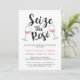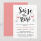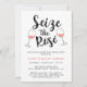 Invitación a la fiesta de degustación de vino rosado en negro, blanco y rosa con un juego de palabras en Aprovecha el día: Aprovecha el rosé. Con dos copas de vino y una bonita letra. También es adecuado para duchas de novia de rosé o fiestas de cumpleaños de rosé. Simplemente cambie el texto personalizado para adaptarlo a su evento. Invitación a evento temático de rosé con rosa como color de acento.
