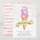 Carta de invitación para la fiesta de cumpleaños de un niño con tema de helados deliciosos con ilustracion acuarela de un cono de gofre con helado morado y rosa. Hay rociadores de oro falsos por ahí. El texto del cartel dice "aquí está la primicia". Perfecto para un cumpleaños de chica en verano.