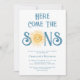 Invita a familiares y amigos a tu baby shower de gemelos con este tierno diseño solar. Cuenta con el texto "Aquí vienen los hijos" en tipografía azul elegante con un sol acuarela amarillo. La parte trasera está decorada con un patrón de sol sonriente. Fácilmente personalizable. Acuarela original © Michele Davies.