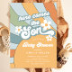 Invitación de Baby Shower retro con un fondo azul intenso de sol, flores de margarita dispersas, arcoiris y las palabras "aquí viene el hijo" en un groovy tipo de letra de los años 70. Voltea nuestra dulce invitación para ver una espalda azul coordinadora.