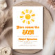 Esta encantadora invitación a la ducha de bebé de los años 60, retro lindo, tiene un sol color de agua amarillo y naranja encima de las palabras "aquí viene el hijo" en la tipografía retro naranja y amarillo. Personalice el texto con el nombre de la futura madre y los detalles en una fuente sans serif marrón sobre un fondo blanco. La parte posterior de la tarjeta es amarillo-naranja sólido. Ideal para la ducha de bebé de un niño.