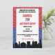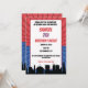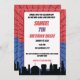 Esta invitación de cumpleaños incluye una silueta de una ciudad, y telarañas con fondo azul y rojo. Esta invitación de superhéroe rojo y azul de cumpleaños está lista para ser personalizada y es adecuada para una fiesta de cumpleaños de superhéroes de araña.
