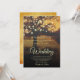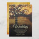 Esta hermosa invitación a la boda presenta un diseño rústico con un árbol cubierto de cuerdas de luces al atardecer impreso en un falso pergamino de fondo. Los colores dorados en tonos tierra marrón son perfectos para una ceremonia de otoño o de noche.