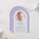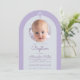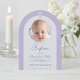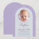 Una invitación de bautizo moderna y neutral en cuanto al género. Dentro de un arco lila (morado claro), tiene un arco casi blanco con una foto de marcador de posición redonda y texto morado (más oscuro) dentro. Sobre la foto, hay una cruz lila. La ocasión y el nombre están escritos con letra de escritura a mano. La foto de marcador de posición de una niña es de Amy Elizabeth Quinn de Pixabay y es gratuita para uso comercial.