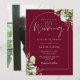 Esta elegante invitación de boda con arco dorado y hojas de vegetación botánica burgundy puede ser personalizada con su información en tipografía chic con su foto especial en el reverso. Diseñado por Thisisnotme©