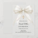Invite a sus invitados con esta sofisticada invitación de Confirmación. El diseño presenta un lujoso lazo de satén marfil adornado con delicadas perlas y una cruz dorada brillante sobre un suave fondo gris paloma. Es una hermosa elección para una joven que celebra su Confirmación.