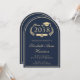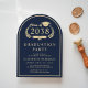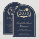 Invitación formal y clásica en forma de arco de color azul oscuro para fiesta de graduación universitaria que incluye "Promoción de" dentro de una ilustración dorada de una corona de laurel que incorpora una gorra de graduado y diploma, y el nombre del graduado en un elegante guión dorado claro. Agregue su escuela, especialidad, honores o planes futuros y los detalles de la fiesta de graduación en letras doradas modernas.