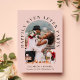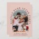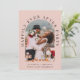 Elegante invitación de anuncio y recepción de boda o fuga romántica en rosa rubor. La parte frontal presenta su foto en un marco de arco y "Fiesta de Felices para Siempre" en tipografía elegante. Agregue sus nombres, fecha de la boda y ubicación. En el reverso, personalice su anuncio e invitación y agregue sus nombres en una escritura similar a una firma.