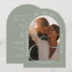 Esta elegante invitación de fiesta de compromiso con arco de fotos de caligrafía en verde menta puede ser personalizada con su información en tipografía moderna. Diseñado por Thisisnotme©